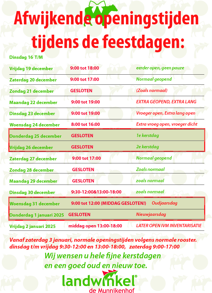 Overige feestdagen die op zondag en/of maandag vallen: gesloten